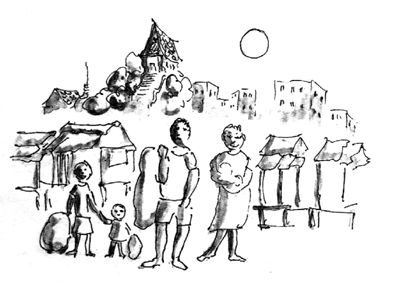and shopkeepers hurried out to fill with rice and food, bowing low
